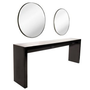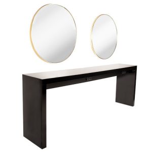 Der Doppelfriseurtisch „Bar Miroir“ besteht aus einem Laminattisch in glänzendem Schwarz mit vier integrierten Steckdosen. Die Spiegel- rund oder quadratisch- sind mit PVC-Rahmen in glänzendem Gold oder glänzendem Schwarz versehen.