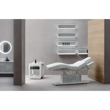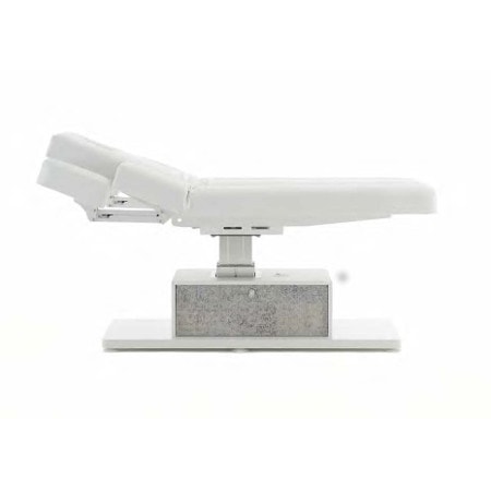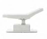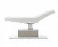 Ausführung mit Servomotoren für die Höhe, das Beinteil und für mögliche Schrägstellungen. Besonders komfortable Polsterung mit hochwertigem weißem Skai-Bezug und verschließbarer Gesichtsöffnung. Die Basis ist anspruchsvoll matt weiß mit seitlich strukturiertem Finish oder mit Holzprofil, das Fussprofil ist aus gebürstetem Edelstahl.