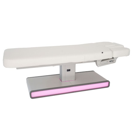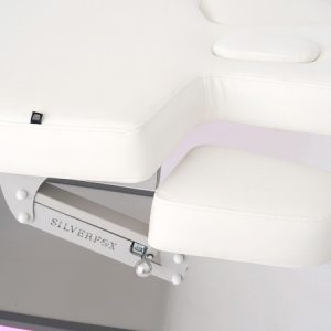 Die Armlehnen sind absenkbar und in der Kopfstütze befindet sich ein Gesichtsausschnitt- optimal für Rückenbehandlungen