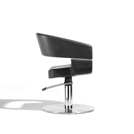 Die optisch schwebende Rückenlehne, die mit einer feinen, matten Aluminiumplatte mit der Sitzfläche verbunden ist, dient nicht nur als ästhetisches Detail – Haarreste lassen sich so leicht wegbürsten oder mit dem Fön wegblasen.
