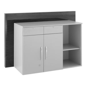 Die Rückseite aus grauem Laminat Grey 031 ist mit 2 sperrbaren Schubladen inkl. Schlüssel, 2 Regalen mit Türen und 2 offenen Regalen versehen und eignet sich somit perfekt als Kassentisch.