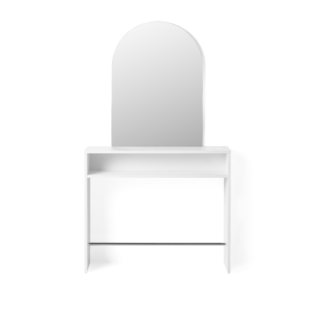 Minimalistischer Friseurplatz mit rechteckigem, gewölbtem Spiegel. Seine optische Leichtigkeit passt perfekt in ein eleganten und aufgeräumten Salon. Mit integriertem Fönhalter und Fußablage.