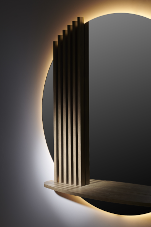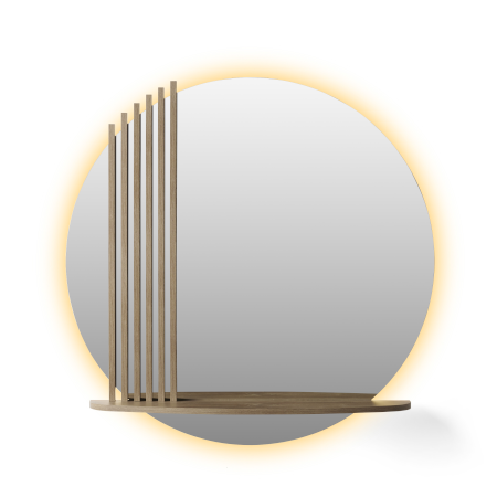 Art Deco Design Wandspiegel mit Holzdetails. Seine schwebende kreisförmige Struktur ist ideal für Friseursalons, die eine raffinierte und andere Note suchen.