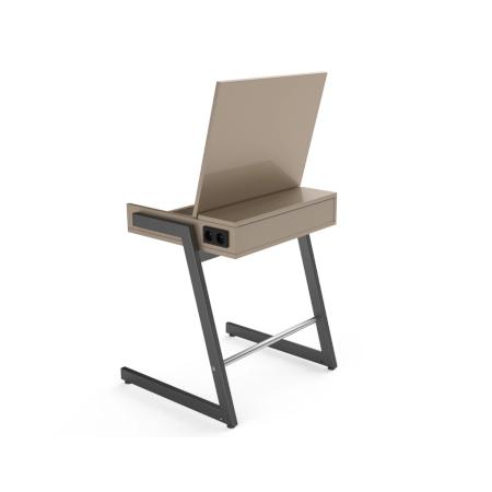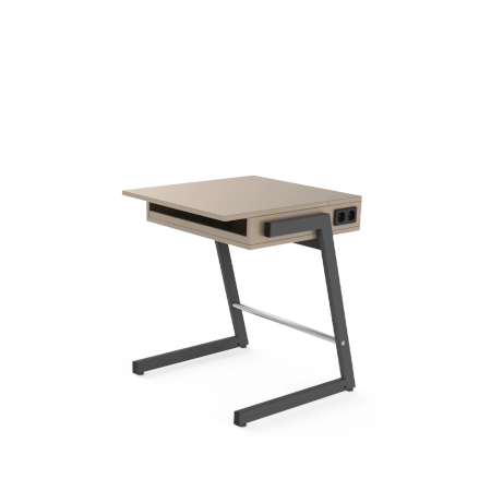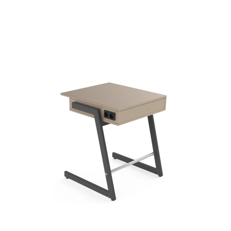 Der Übungstisch ist für Friseurschulen gedacht, die Theorie und Praxis in einem Klassenzimmer kombinieren möchten. Der Tisch verfügt über eine klappbare Platte mit einem Spiegel auf der Innenseite, eine Fönhalterung und eine Fixiermöglichkeit für den Übungskopf. Elektrische Kabel können durch die Innenseite des Schminktisches zur eingebauten Steckdose geführt werden. Das Metallgestell des Tisches ist pulverbeschichtet in Basaltgrau. Das Dekor des Holzkorpus kann aus den Kiela-Laminaten gewählt werden.