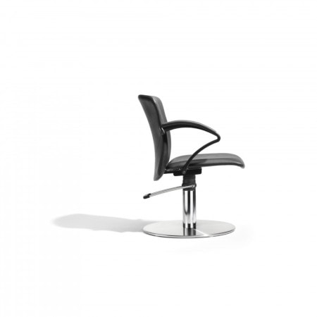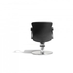 Der Friseurstuhl „Symphony“ von Kiela bietet unübertroffenen Sitzkomfort dank einer hohen und breiten Rückenlehne, einer ergonomisch geformten Sitzfläche und Armlehnen aus schwarzem Kunststoff mit gepolsterten Armauflagen.