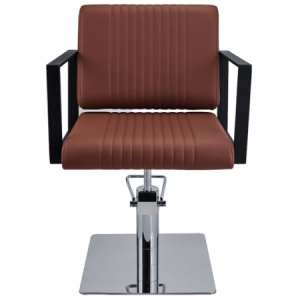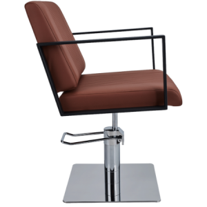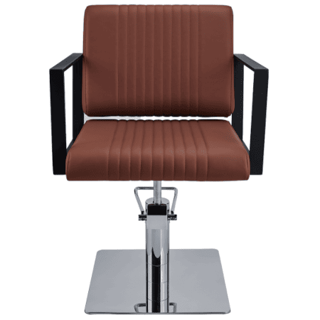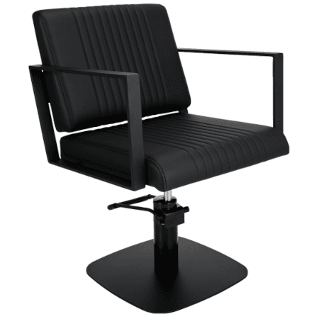 Der „Ted„– ein sehr bequemer und moderner Friseurstuhl mit schwarz lackierten Armlehnen aus Metall,