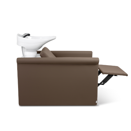 • Brauner Friseurstuhl mit integriertem Waschbecken, ideal für Salons, ergonomisches Design für komfortable Haarwäsche.