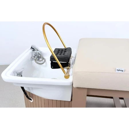 Das Waschbecken aus Acryl mit goldenem Waschring unterstreicht die elegante und beruhigende Wirkung der Liege.