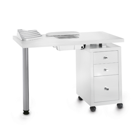 Der Tisch ist außerdem mit einem Handauflagenkissen für den Kunden und einem Thekendisplay für Nagellack ausgestattet.