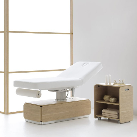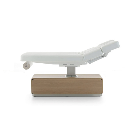 Die elektrische Massageliege „Nat Evo“ von Vismara mit einer Säule aus melaminbeschichteter Platte, erhältlich in 7 verschiedenen Ausführungen. Die Matratze aus weißem Skai-Leder verfügt über eine Gesichtsaussparung mit Abdeckung und eine Rollenhalterung. Liegehöhe und Rückenlehnenneigung lassen sich bequem per Fernbedienung verstellen. Der Unterbau ist mit einer Klapptür ausgestattet und kann als Ablagefläche für Accessoires genutzt werden. Auch mit Mover-Funktion erhältlich.