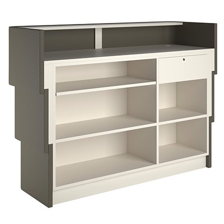 Mit der modernen QL Desk Rezeption von Gamma & Bross mit bezogener Front in Skai verleihen Sie Ihrem Empfangsbereich eine besondere Note. Der Schrank auf der Rückseite ist wählbar in schwarz oder weiß.