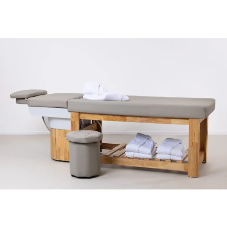 Das Simply Head Spa Woody verbindet modernes Wellness-Design mit natürlicher Eleganz. Die Kombination aus hochwertiger Polsterung in Beige und stilvollem Holzuntergestell schafft eine warme, harmonische Atmosphäre – ideal für exklusive Head-Spa- und Salonkonzepte.