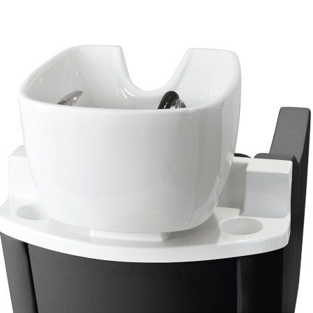 „Nirvana“ verfügt über ein breites, tiefes und kippbares Keramikbecken inkl. Mischbatterie und Brausekopf sowie einer praktischen Ablagefläche aus Polyurethan für beispielsweise Shampoos unter dem Waschbecken.
