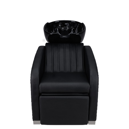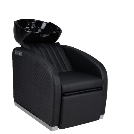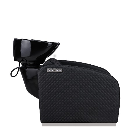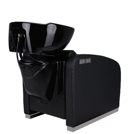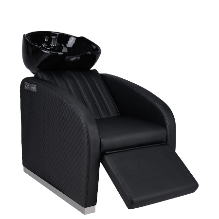 Das Friseurwaschbecken „Sheldon“ ist eine kompakte Waschanlage mit einem weich gepolsterten Sitz mit vertikalen Nähten, einer elektrischen Beinstütze und einer Shiatsu-Massage für maximalen Kundenkomfort.
