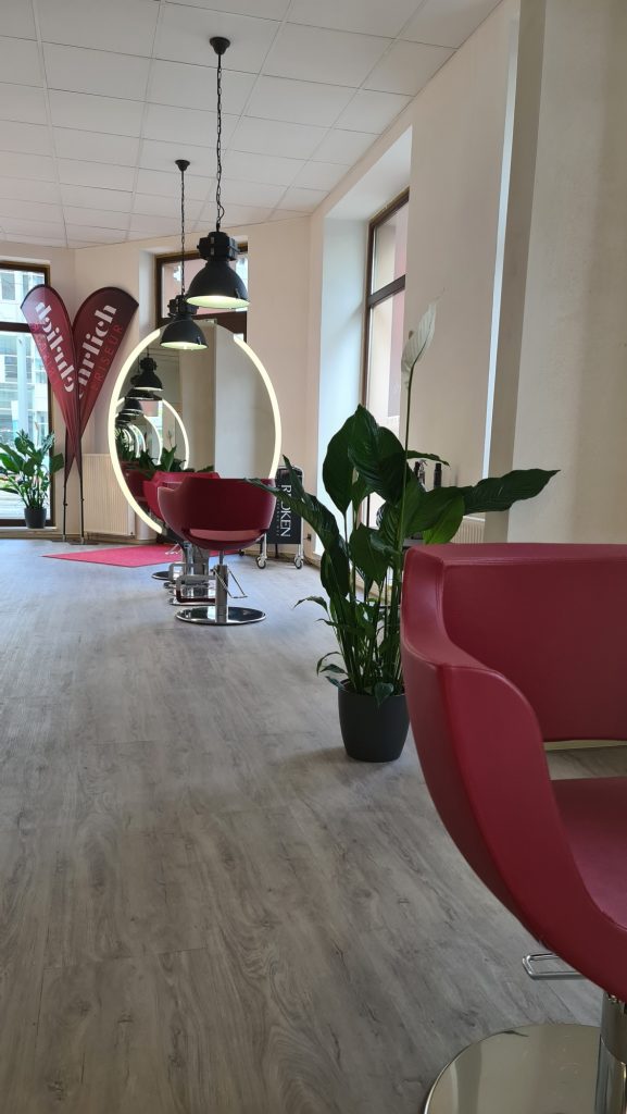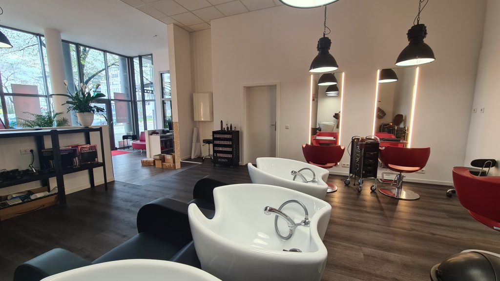 Der Friseursalon Ehrlich Friseur in Dresden ist elegant und in schwarz-rotem Stil eingerichtet.